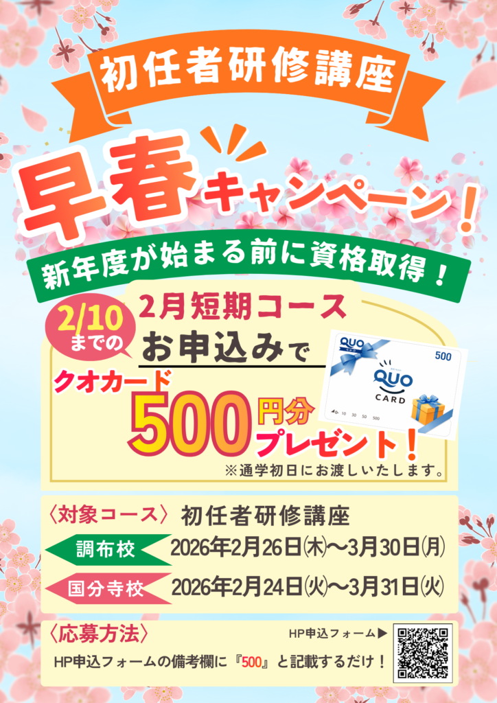 ホームページから2/10までにお申込み→お支払い後申込確定→開講日初日通学時にQUOカードを進呈します。